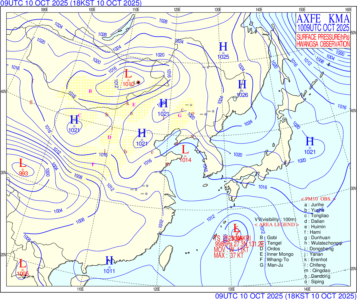 - 2025-10-10 18:30:00 o 폭풍해일주의보 : 경기도(안산, 시흥, 김포, 평택, 화성), 인천(옹진군 제외)