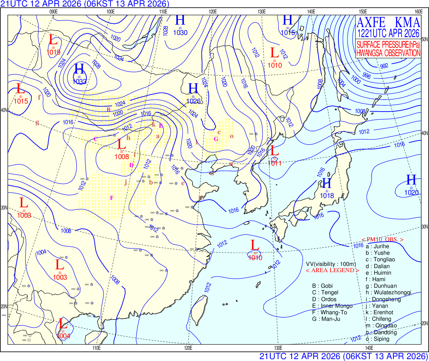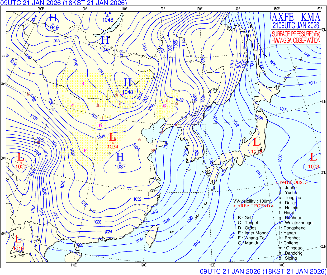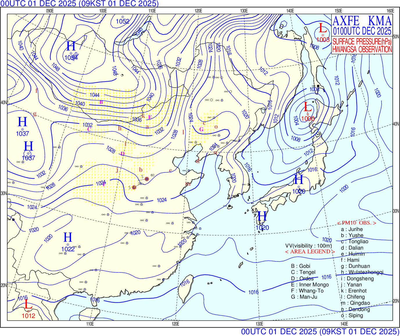노란색은 사막지역, 적색은 황사가 관측된 지점을 표시합니다.